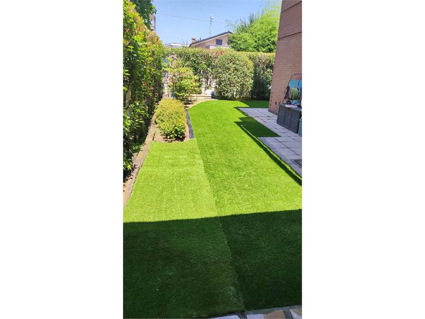 Porte finestre che accedono al giardino di proprieta con irrigazione automatica, inferriate di sicurezza su ogni apertura verso l'esterno e box box doppio in lunghezza.
